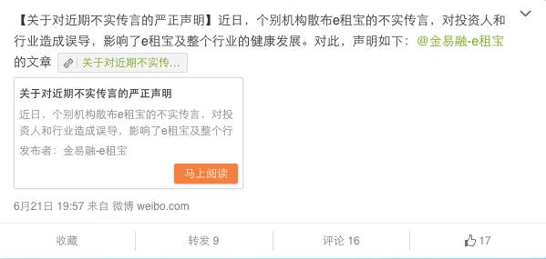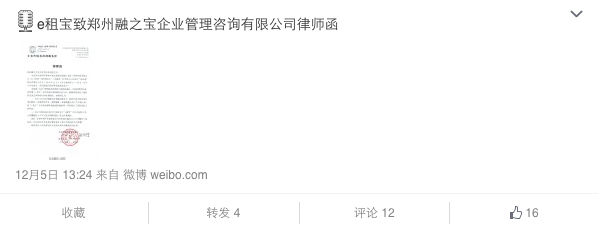 圖片來自無界新聞 昨天晚上開始,e租寶官網(wǎng)、APP均無法正常打開,一度引發(fā)了投資人的恐慌。e租寶官方微博稱是為了“防止不實(shí)傳言引發(fā)恐慌和無序贖回、提現(xiàn),本著保護(hù)客戶資金安全、平臺(tái)交易安全的原則,e租寶平臺(tái)主動(dòng)向社會(huì)各界公布暫停平臺(tái)交易。” 為解答投資人普遍擔(dān)心的資金安全題目,e租寶的客戶經(jīng)理向他們?nèi)喊l(fā)短信表示“團(tuán)體在調(diào)查期間,主動(dòng)封鎖凍結(jié)了中信銀行風(fēng)險(xiǎn)保證金11億和足以籠蓋剛性兌付的應(yīng)兌付客戶本金和收益”。 但是!今天中信銀行出來打臉了!據(jù)網(wǎng)易財(cái)經(jīng)報(bào)道,中信銀行稱“e租寶在中信銀行并無風(fēng)險(xiǎn)備用金賬戶,僅開立活期賬戶余額0元!” 知道真相的投資者們眼淚有沒有掉下來?