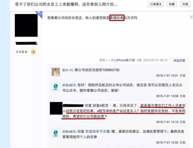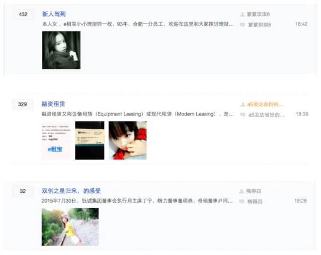 另外,鈺誠團(tuán)體成立的人武部也被該員工稱為是鈺誠彈壓上門討要工資員工的黑社會(huì)組織,鈺誠的董事長(zhǎng)丁寧要下屬稱其為“丁主席”,稱總經(jīng)理魏引忠為“政委”。搜索百度百科,人武部即人民武裝部是我國(guó)在縣(旗,縣級(jí)市、市轄區(qū))、鄉(xiāng)(鎮(zhèn))和大中型廠礦、大專院校設(shè)立的軍事工作部分,企業(yè)中固然也有設(shè)立人武部的但都是國(guó)有大中型企業(yè),像鈺誠團(tuán)體這樣的中外合資公司是否有資格成立人武部,相信良多人心中都會(huì)存有迷惑,但是當(dāng)時(shí)人武部成立揭牌典禮的時(shí)候,當(dāng)?shù)剀姺謪^(qū)領(lǐng)導(dǎo)、市區(qū)政府領(lǐng)導(dǎo)、人武部相關(guān)領(lǐng)導(dǎo)及全國(guó)多家媒體均有出席,還有良多報(bào)道稱之積極支持國(guó)防建設(shè)。 小插曲 打開e租寶的百度貼吧就可以看到一種與公司高大上不相符的氣質(zhì),良多都是所謂的新入人員工爆照。