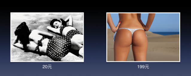 價(jià)格有什么變化?我年青時(shí)候左邊一大盤(pán)差未幾有一斤肉,在東北的菜館一定有一斤肉,差未幾要 8 塊錢,F(xiàn)在呢?36 塊錢。我想拿這個(gè)說(shuō)明一下消費(fèi)觀念的變化跟發(fā)展水平是息息相關(guān)的。 再看一下這個(gè)例子,我年青的時(shí)候假如去海灘上看看,婦女們穿的泳裝基本是這樣子,包住臀部的樣子比腦袋還要大。這些年我們?nèi)ズ┛吹降挠狙b已經(jīng)是這個(gè)樣子。價(jià)格發(fā)生了什么變化?左邊那么多布料用了 20 塊錢,右邊基本沒(méi)用布料,我們甚至懷疑那是不是布料,它還要 199 塊錢。所以良多時(shí)候就是這樣非常簡(jiǎn)樸的道理,外國(guó)人不知道,由于那些發(fā)達(dá)國(guó)家沒(méi)有經(jīng)歷過(guò)這樣的時(shí)代,但是我們很清晰。