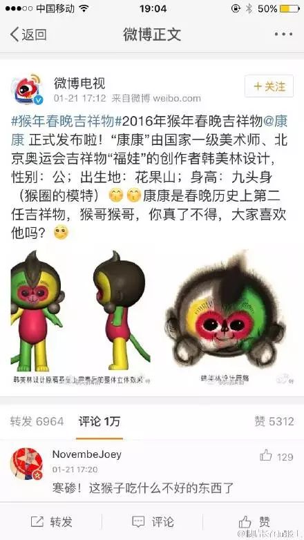也難怪在央視發(fā)布吉利物的半個小時內(nèi),評論就已經(jīng)由萬,微博話題#猴年春晚吉利物#三個小時閱讀量就達811萬,討論5.3萬,登上微博排行榜第一名。