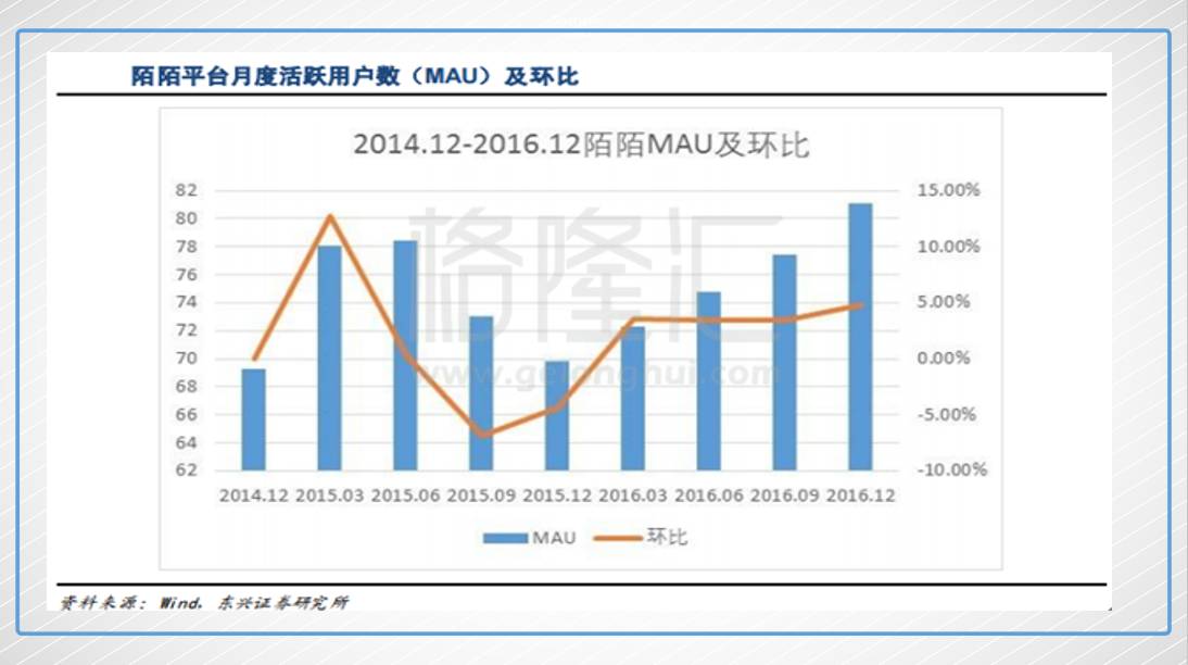 天然,陌陌股價(jià)這么的大漲,離不開其牛X的成果增加。2016年是直播大發(fā)展的一年,陌陌依托著直播的風(fēng)口取得了驚人的成果——16年收入同比增加313%,贏利則翻了9.6倍。同時(shí),在直播的股動(dòng)下,其要害的月活(MAU)也得以康復(fù)增加,去年底陌陌渠道月活數(shù)為8110萬,實(shí)在是打了一個(gè)美麗的翻身仗。