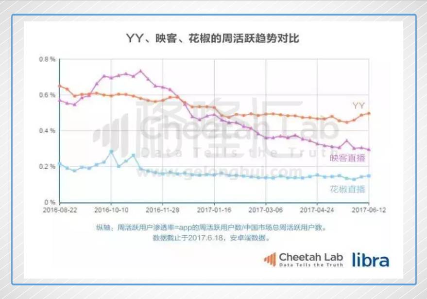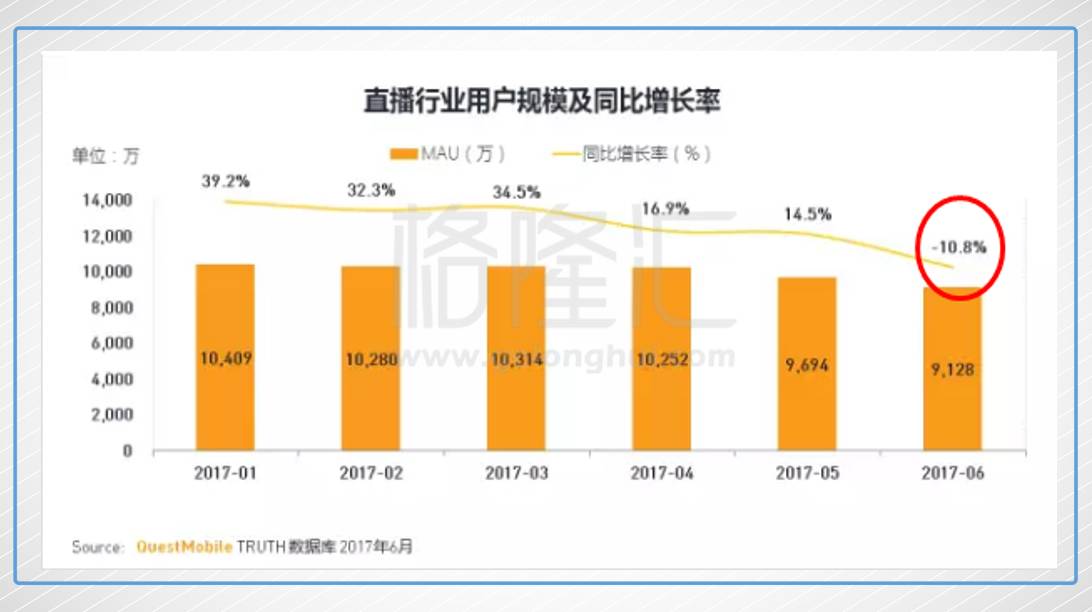 因?yàn)榉结樬厙?yán),直播內(nèi)容遭到很大約束,加之內(nèi)容同質(zhì)化嚴(yán)重,許多渠道都呈現(xiàn)了用戶丟失的景象。依據(jù)QuestMobile最新發(fā)布的陳述顯現(xiàn),直播職業(yè)月活潑用戶規(guī)劃從2017年1月的10409萬人,降至6月的9128萬人,同比增加為-10.8%。這是直播職業(yè)用戶規(guī)劃初次呈現(xiàn)負(fù)增加。