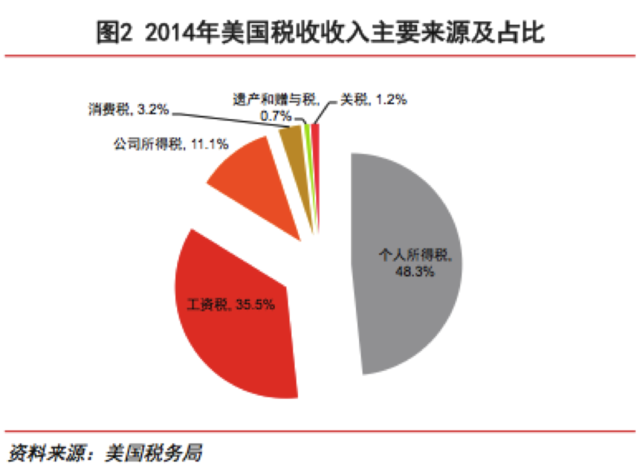 同年,美國稅收收入(財政收入中去除無法歸類的其他收入)為 2.9萬億美元,包含個人所得稅、工資稅和企業(yè)所得稅等的直接稅種占比高達95.6%,其中,個人所得稅就占到了稅收收入的將近一半。