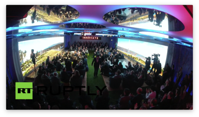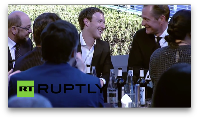 【圖說:施普林格官網(wǎng)及其旗下的眾多報(bào)紙,發(fā)布了良多照片造勢(shì),但這樣“哥倆好”的畫面及會(huì)場(chǎng)全景只能辛勞地到俄國人發(fā)布的視頻中去截圖。RT威武! 歐洲反谷歌旗手、阿克塞爾·施普林格團(tuán)體CEO馬塞亞斯·多夫納(上圖為小扎頒獎(jiǎng)?wù)撸┰陬C獎(jiǎng)儀式上給了扎克伯格高度的評(píng)價(jià),這樣的評(píng)價(jià)大家早就耳熟能詳了,值得引述的只有這一句,“Facebook 作為一個(gè)成功的分發(fā)平臺(tái),是媒體的公平(fair)伙伴”。這句話,可能半真半假,似是而非,良多媒體人與媒體機(jī)構(gòu)是并不認(rèn)同的。多夫納心里,可能也并不完全是這樣想的,只是,與谷歌比擬,他們還沒有反目。 扎克伯格在儀式上,也只撿大家愛聽的講。好比,他在獲獎(jiǎng)感言中揄揚(yáng)自己換尿布的技術(shù)如何高明,花20秒就可以搞定。他也不忘了談一下他的標(biāo)牌性T恤。這些輕松的話題,讓他與一房子的老歐洲精英們一起會(huì)心地微笑。那些嚴(yán)厲的具有爭(zhēng)議的重大方向性話題,以及門外零星的抗議者,換個(gè)場(chǎng)合再議吧。 為了表示對(duì)于頒獎(jiǎng)?wù)叩淖鹬兀≡鷵Q了身西服,但是,為了表示他不向金科玉律屈服,他仍舊率性地不戴領(lǐng)帶。
