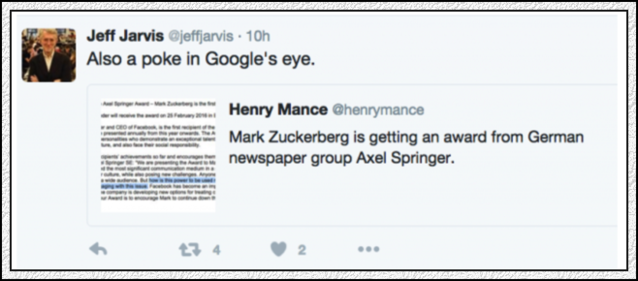 【圖說:在谷歌陣營(yíng)的人看來,這場(chǎng)流動(dòng)來者不善。聞名的親谷歌學(xué)者杰夫·杰維斯開玩笑說:這不是戳谷歌的眼睛嗎!】 谷歌是傳統(tǒng)媒體的敵人,臉書也是。不外,此一時(shí),彼一時(shí),合縱聯(lián)橫的政治婚姻、神圣聯(lián)盟隨時(shí)都會(huì)泛起。傳統(tǒng)媒體指望通過這樣的借力使力,在縫隙間生存,讓自己借機(jī)發(fā)展壯大,是一廂情愿的。但是,傳統(tǒng)媒體的確不能關(guān)起來門來自娛自樂,孤芳自賞,必需與狼共舞,踩著高科技的節(jié)奏飛上一會(huì)。 此外,高科技巨頭們對(duì)于新聞業(yè)發(fā)展的貢獻(xiàn),也是無法無視的,事實(shí)上,后人們?cè)谧珜懶侣勈返臅r(shí)候,谷歌、臉書這些門外的野蠻人將成為當(dāng)然的主角,全球各地精英新聞學(xué)院出身的精英專業(yè)人士,從來不是新聞史臺(tái)面上確當(dāng)然主角,也永遠(yuǎn)不會(huì)是(很殘酷,是不是?但符合顛覆者不來自內(nèi)部的鐵律)。施普林格把第一個(gè)施普林格獎(jiǎng)?lì)C給小扎,小扎當(dāng)之無愧。而那個(gè)沒有泛起在頒獎(jiǎng)儀式上助興的谷歌,假如馬塞亞斯·多夫納足夠大度的話,同樣應(yīng)該在某年授與其一個(gè)大獎(jiǎng)。由于,谷歌對(duì)于新聞業(yè)的發(fā)展作出的貢獻(xiàn),比臉書早,迄今為止,也一點(diǎn)不比臉書小。當(dāng)然,谷歌對(duì)于新聞業(yè)的轔轢與臉書一樣,怎么評(píng)估都不會(huì)過份。 歷史,不都是以這樣的方式寫就的嗎? 稍等,新聞業(yè)(journalism)這個(gè)詞在有了谷歌與臉書之后,是不是需要重新定義了?在中國,有了早年的新浪、網(wǎng)易、搜孤,稍后的 BAT 之后,是不是也需要重新定義了?新聞早就不是原來的那個(gè)新聞,新聞業(yè)也早就不再是早先的那個(gè)新聞業(yè)了。