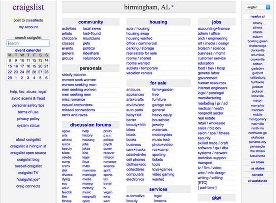我通常用Craigslist的案例來分析。正如上圖你所看到的,這個(gè)網(wǎng)站的主頁(yè)就是一堆藍(lán)色的文字鏈,設(shè)計(jì)者把他們按照一定的分類進(jìn)行排放,這種設(shè)計(jì)就像1999年互聯(lián)網(wǎng)剛開始興起時(shí)的風(fēng)格樣式。但是效果卻非常好,Craigslist是世界上最聞名的分類廣告網(wǎng)站。(請(qǐng)參照海內(nèi)的58趕集)