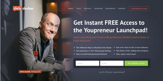 好的圖片對(duì)于主頁(yè)設(shè)計(jì)來說至關(guān)重要。特別是Chris Ducker,他是圖片使用方面的專家,他將自己的照片放在網(wǎng)站主頁(yè)上,照片中他的目光凝視著網(wǎng)頁(yè)上的信息欄和CTA,意在表示自己但愿大家能夠響應(yīng),用戶往往會(huì)受到圖片的暗示,留意力順著他的目光看向右邊,然后進(jìn)行相應(yīng)的動(dòng)作,終極完成轉(zhuǎn)化。