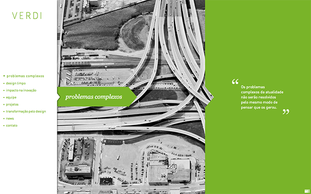 6.VERDI的網(wǎng)站頁面運(yùn)用了色塊“拼接”的效果,從白到灰再到綠色。白色和灰色都是中性色,所以頁面中的綠色很天然的成了最搶眼的一部門,這樣的搭配方式也讓畫面更富有運(yùn)動(dòng)感。