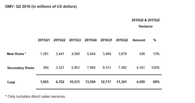 ![]() 2016年8月25日,在美國紐約上市的搜房(房天下 SFUN)宣布了本年度第二季度的業(yè)績。 2016年第二季度的總收入為2.87億美元,收入同比增長率為34.2%;其中互聯(lián)網(wǎng)服務(wù)e-commerce service 收入為1.895億美元,同比增長率高達(dá)77.4%。 2016年第二季度EPS 是-0.09,虧損金額遠(yuǎn)低于華爾街分析師預(yù)計(jì)EPS 均勻值的-0.12。 此外,本季度公司的GMV 增長勢頭不錯,同比金額增長68%,這個指標(biāo)是搜房轉(zhuǎn)型的重要經(jīng)營業(yè)績指標(biāo)之一。以下為公司所宣布的各季度GMV 增長情況: