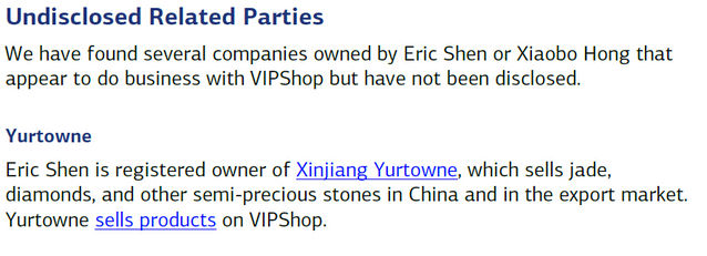 J CAP稱,董事長兼CEO沈亞、副董事長兼COO洪曉波至少持有三家公司與唯品會產(chǎn)生聯(lián)系關(guān)系交易。J CAP指出,沈亞控制的國玉這家公司(http://www.yurtowne.com)在唯品會上售賣產(chǎn)品。