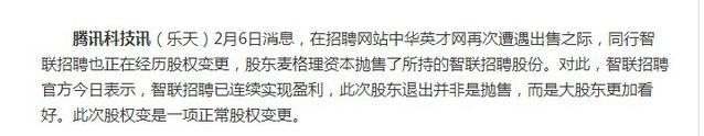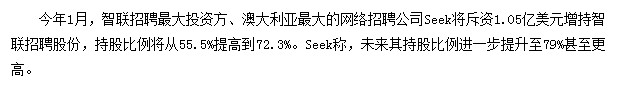 圖2:在窩窩團(tuán)招股書Preferred Shares一欄中寫到,窩窩團(tuán)在2011年4月的A-1輪融資中獲得了清科資本的500萬美元融資;5月和6月,鼎暉、清科分別跟投了3000萬、200萬美元;7月,Besto Holdings、天助等機(jī)構(gòu)共計(jì)注資1800萬美元。2012年2月B輪融資中再獲得1250萬美元的融資。 窩窩團(tuán)虛報(bào)融資是一個(gè)最具代表性的案例。窩窩團(tuán)最開始向外公布上述融資動(dòng)靜時(shí),聲稱融資將來自高盛。而媒體就此事采訪高盛時(shí),其相關(guān)負(fù)責(zé)人表示,對此事不作評論,但又建議記者,應(yīng)當(dāng)繼承關(guān)注這條動(dòng)靜,真相會(huì)得到澄清。 高盛謹(jǐn)嚴(yán)克制的暗示背后,代表了窩窩團(tuán)在資本市場上的潛伏危機(jī)。虛報(bào)融資這一行為,很可能導(dǎo)致外界在觀感上把VC/PE當(dāng)成同謀,危及投資機(jī)構(gòu)的信譽(yù)、職業(yè)道德。而如斯開罪資本世界中的聞名機(jī)構(gòu),其實(shí)“勇敢”。 第二名、 智聯(lián)招聘651萬美元變1億美元報(bào)道融資額:1.05億美元 真實(shí)融資額:651萬美元 2013年1月,智聯(lián)招聘二股東麥格理拋售了手中全部股份,總價(jià)約近億美元。隨后有動(dòng)靜稱Seek斥資1.05億美元接手麥格理拋售的股份,同時(shí)智聯(lián)招聘官方也公然回應(yīng),稱二股東麥格理退出并非是拋售,而是大股東Seek更加看好。 在這起交易后,智聯(lián)招聘估值達(dá)到了5.58億美元。 以下為媒體報(bào)道截圖: