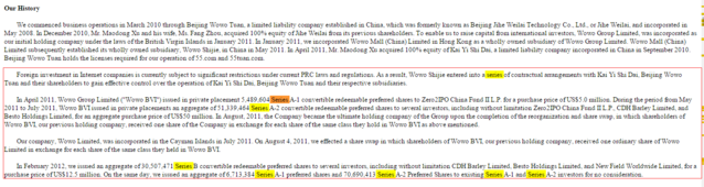 圖1:在窩窩團(tuán)招股書History一欄中寫到,窩窩團(tuán)在2011年4月的A-1輪融資中獲得了清科資本的500萬美元融資,2011年的5月到6月,A-2輪融資中獲得清科資本、鼎暉投資和Besto Holdings等共計(jì)5000萬美元的融資。在2012年2月B輪融資中再獲得1250萬美元的融資。