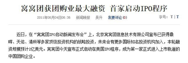 文\X教授(微信公家號:X_Man_Investment) 在大眾創(chuàng)業(yè)的背景下,初創(chuàng)企業(yè)A輪百萬、B輪C輪數(shù)千萬美金的融資新聞,已經(jīng)不能在科技媒體上吸引眼球與流量了。每隔幾天,就會(huì)有此前默默無聞的公司公布進(jìn)行金額聞所未聞的融資。有趣的是創(chuàng)投界的神話,往往會(huì)自我祛魅和揭穿。 虛假融資成風(fēng)有強(qiáng)烈的內(nèi)在邏輯驅(qū)動(dòng)。游戲介入方甚至能得到皆大歡喜的局面。對創(chuàng)業(yè)者而言,浮夸的數(shù)額吸引眼球,能夠成為免費(fèi)的公關(guān)流動(dòng),利便拉人入伙、市場拓展乃至遏制競爭對手。 對投資者而言,包裝出來的“欣欣茂發(fā)”態(tài)勢,利便擊鼓傳花的資本游戲進(jìn)行下去。易凱資本創(chuàng)始人兼首席執(zhí)行官王冉,在一次演講中就說過:“一家公司融了3000萬美元,然后新聞報(bào)出來就是8000萬美元,融了1億美元報(bào)出來可能是3億美元。那既然你這么做了,他的競爭對手看到了,通常競爭對手也會(huì)采用同樣的方式。由于做乘法并不難,乘以2、乘以3基本就可以了,然后圈里知道都會(huì)這么做,又會(huì)除歸來,所以除法也并不難。” 未上市企業(yè)因不需要向公家表露企業(yè)信息,還能繼承講故事虛報(bào)融資;而一旦謀劃上市,遞交包含招股書在內(nèi)的諸多文件,過去所有的融資真實(shí)情況就會(huì)暴露,尤以美股市場為甚。 只需要簡樸的英文能力,詳閱招股書,便能發(fā)現(xiàn)此間的蹊蹺。進(jìn)入筆者視野的五家公司,固然間隔上市之初過去了許久,且不乏洗白成功登堂入室者,但恰是作惡者的上行下效,現(xiàn)在虛報(bào)融資額之風(fēng)才越刮越烈,這也是“算舊賬”的意義所在。 有上市潛力的優(yōu)質(zhì)創(chuàng)業(yè)者介入融資數(shù)額造假游戲,最為愚蠢。由于假如公司做的好,很快就會(huì)下一輪融資,而一輪要比一輪融資規(guī)模大,因此假話將一個(gè)接著一個(gè),最后進(jìn)行證券登記時(shí),假話難圓。 出來混早晚是要還的,筆者收拾整頓的五家互聯(lián)網(wǎng)企業(yè):狂風(fēng)科技、智聯(lián)招聘、唯品會(huì)、歡聚時(shí)代、窩窩團(tuán)。有的正在遭遇訴訟,有的在被徐徐遺忘,有的雖有可稱為“傳奇”的成功,但未來將如A股走勢般兇險(xiǎn)。 第一名: 窩窩團(tuán)融資額翻4倍報(bào)道融資額:2億美元 真實(shí)融資額:5500萬美元 2011年5月,窩窩團(tuán)高調(diào)公布首輪融資將達(dá)2億美元,是當(dāng)年團(tuán)購業(yè)內(nèi)單筆融資的最大規(guī)模,融資方為鼎暉、天助、清科等。 以下為媒體報(bào)道截圖: