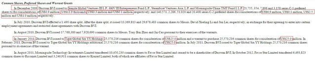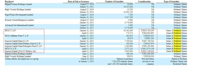 圖8:唯品會(huì)招股書顯示,唯品會(huì)在2011年4月11日獲得紅杉和DCM的實(shí)際融資金額為(3,904,865+95,283+11,974,108+25,249,636)=41,223,892美元。 |