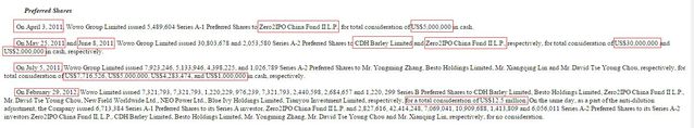 但翻出窩窩團(tuán)招股書中的History、Preferred Shares及Financing actvities三欄數(shù)據(jù),整個(gè)2011年窩窩團(tuán)共計(jì)融資為5500萬美元,約為報(bào)道2億融資額的1/4。 2011年4月,清科資本投了500萬美元。接下來5月和6月,鼎暉、清科分別跟投了3000萬、200萬美元。7月,Besto Holdings、天助等機(jī)構(gòu)共計(jì)注資1800萬美元。 招股書詳細(xì)信息如下: