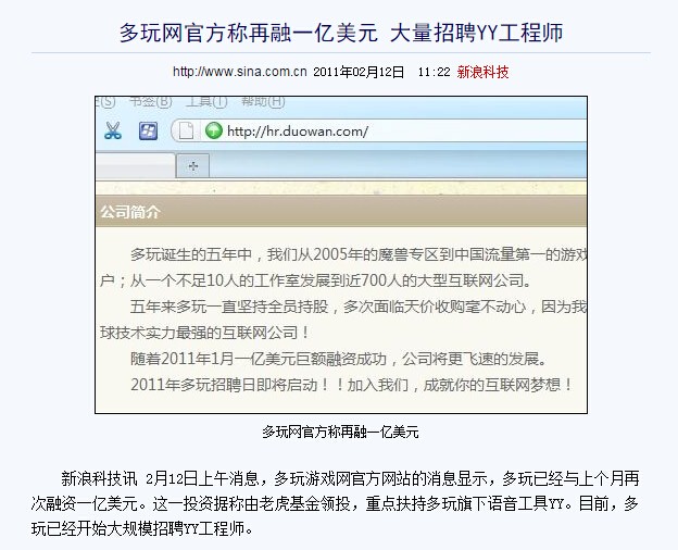 圖3:智聯(lián)招聘招股書中寫到,2013年2月28日,智聯(lián)向Seek發(fā)售3,061,591股普通股,價(jià)值僅32.9141萬美元;2013年10月31日,智聯(lián)又向Seek增發(fā)6,488,409股普通股,價(jià)值為528.4834萬美元。兩次合計(jì)注資約561萬美元。 第三名、 歡聚時(shí)代強(qiáng)調(diào)2300萬報(bào)道投資額:1億美元 真實(shí)投資額:7700萬美元 2011年2月,多玩網(wǎng)曾公布獲得1億美元融資,這一投資由老虎基金領(lǐng)投。 以下為媒體報(bào)道截圖: