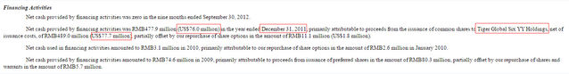 圖4:2011年8月,YY曾三次向老虎基金發(fā)售普通股共計(jì)7500萬美元。