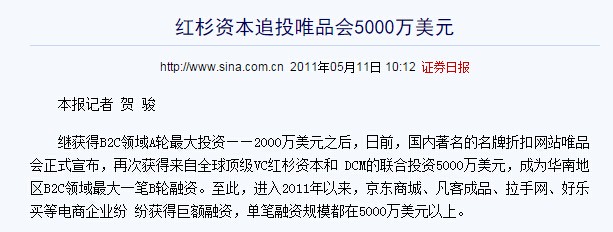 圖7:2007年7月26日,B輪融資,向IDG增發(fā)B輪優(yōu)先股5,643,990股,每股0.8859美元,對價(jià)為500萬美元。 第五名、 唯品會(huì)灌水近900萬報(bào)道融資額:5000萬美元 真實(shí)融資額:4120萬美元 2011年5月,唯品會(huì)公布獲得紅杉資本和DCM的聯(lián)合風(fēng)險(xiǎn)投資5000萬美元。有趣的是,為了能給自身項(xiàng)目冠以“最大的”稱號,公關(guān)部分使用了“華南地區(qū)”這樣的定語。 以下為媒體報(bào)道截圖: