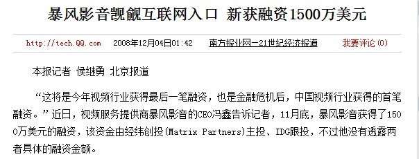 圖5:在招股書financingactivities一欄可以看出,截止到2011年12月31日,YY所有融資金額主要來自老虎基金的7770萬美元。 由圖4也可看出,YY并不止一次虛報(bào)融資額。在2009年,YY稱獲2300萬融資,但招股書顯示2009年12月獲C-1輪融資143.9萬美元,C-2輪融資1050萬美元,共計(jì)1193.9萬美元,僅為報(bào)道融資額2300萬美元的一半。 四、 狂風(fēng)科技融資金額600萬變1500萬報(bào)道融資額:1500萬美金 真實(shí)融資額:600萬美金 創(chuàng)造了40多個(gè)漲停紀(jì)錄的狂風(fēng)科技,在近期股市持續(xù)震蕩大跌之前卻“神奇”停牌,目前股價(jià)還保持高位?耧L(fēng)曾多次謀求登陸美股未果,無奈拆VIE后回歸海內(nèi),卻成就了“妖股”,但這時(shí)代的幸運(yùn)兒,也有“黑歷史”。 2008年12月,狂風(fēng)影音CEO馮鑫公布前一個(gè)月獲得1500萬美元融資,由經(jīng)緯創(chuàng)投主投、IDG跟投,當(dāng)時(shí)的媒體報(bào)道截圖如下: