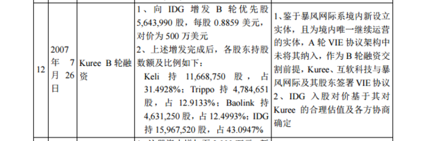 圖6:狂風(fēng)科技招股書中寫到B+輪融資額為600萬美元,融資方為IDG資本及經(jīng)緯創(chuàng)投。 2007年4月,狂風(fēng)影音公布獲得600萬美元融資,但狂風(fēng)科技招股書顯示,2007年7月B輪融資為500萬美元。