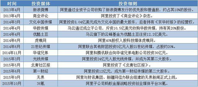據(jù)悉,封面將主打新聞客戶端,以The cover.cn網(wǎng)站為基礎(chǔ),涵蓋微博 、微信、視頻、數(shù)據(jù)、論壇、智庫等,并逐步推出多個垂直細(xì)分領(lǐng)域的產(chǎn)品矩陣。未經(jīng)證明的傳說傳聞稱,這次阿里為了打造封面?zhèn)髅剑幌С?億巨資。 四川日報作為傳統(tǒng)媒體,此刻搭上了資本的順風(fēng)車,搖身一變成為新媒體,無疑再次令不少傳統(tǒng)媒體同行艷羨不已。而阿里作為傳媒領(lǐng)域的投資老手,近兩年通過不同的資本運作方式,已控制了海內(nèi)多家媒體的話語權(quán)。 那么題目來了,阿里如斯瘋狂擴張傳媒版圖背后的邏輯到底是什么呢? 投資觸角不斷延伸,阿里瘋狂擴張傳媒版圖 從過往歷史中不難發(fā)現(xiàn),阿里此前也曾多次進行過傳媒領(lǐng)域的投資。其中,影響力最大、最深遠(yuǎn)確當(dāng)屬阿里對第一財經(jīng)的投資。 四個月前,阿里以24億元巨額投資第一財經(jīng)的動靜瞬間引爆整個互聯(lián)網(wǎng)圈,所引起的轟動好像仍在面前。 當(dāng)時,第一財經(jīng)頂著中國唯逐一家集廣播、電視、日報、網(wǎng)站、雜志于一體的中國專業(yè)財經(jīng)媒體的光環(huán),而且其平面媒體包括海內(nèi)著名度頗高的財經(jīng)類報紙《第一財經(jīng)日報》和財經(jīng)類雜志《第一財經(jīng)周刊》,阿里的想法主意是憑借自身的資本和渠道,以及一財?shù)挠绊懥,將后者打造?ldquo;中國版彭博社”。 但阿里的野心不止步于此,實際上,自2013年開始,阿里在傳媒領(lǐng)域的投資動作就從未中斷,且投資觸角已陸續(xù)伸向傳統(tǒng)平面媒體、影視公司及新媒體。