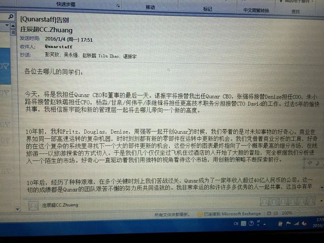 1月4日,去哪兒網(wǎng)創(chuàng)始人、CEO莊辰超發(fā)內(nèi)部信公布即日起卸任去哪兒CEO和董事一職。諶振宇將接替莊辰超出任去哪兒CEO。