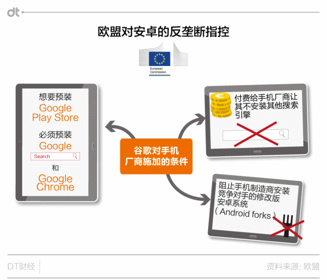 實在,一開始歐盟成立調(diào)查組,就是為了避免案件像此前的微軟反壟斷案一樣,一拖就是十多年。歐盟起初但愿可以快速找到證據(jù),對谷歌進行懲罰。但事到如今回頭看,歐盟顯然沒能實現(xiàn)愿望,如今案件也拖了近六年,而且終極仍是要靠正式訴訟來終結(jié)糾紛。 《逐日電訊報》的報道中,也引述分析人士稱,在多年的糾纏之后,谷歌已經(jīng)不想再繼承耗費精力財力,也打算接受罰款終止案件。 歐盟放大招,歷數(shù)谷歌安卓系統(tǒng)的三大罪狀 那么歐盟這30億的罰款,畢竟是因為谷歌的什么罪狀呢? 上月底,歐盟發(fā)布的最新聲明,將戰(zhàn)線擴展到了谷歌移動市場的核心業(yè)務(wù)——安卓系統(tǒng)。在歐盟的官方聲明中,歐盟指出了谷歌的三大罪狀: