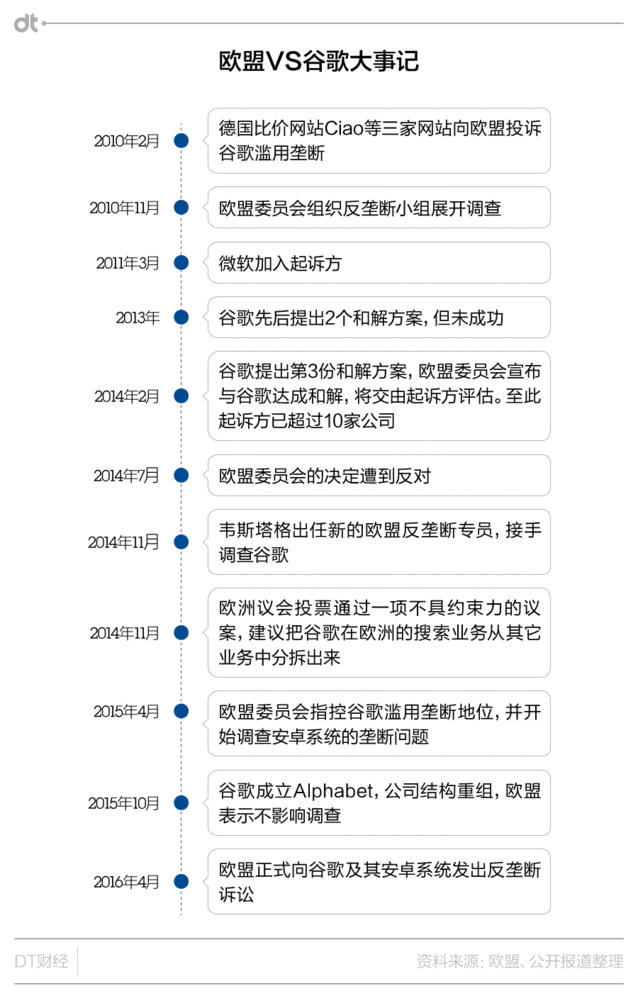 谷歌的反壟斷案,可能即將以30億罰款來終結(jié) 據(jù)英國《逐日電訊報》報道,歐盟委員會近期將公布對谷歌涉嫌壟斷的罰款數(shù)額,而這一數(shù)字可能高達破紀錄的30億歐元。而到目前為止已有的最高反壟斷罰單,是2009年對芯片制造商英特爾公司11億歐元罰款。 讓谷歌雪上加霜的是,這30億歐元恐怕還不是上限,根據(jù)相關(guān)法律,歐盟委員會最高可以對公司處以其年營業(yè)額10%的罰款。也就是說,谷歌公司面對的罰款上限將達60億歐元。 事情大概是這樣的:2010年下半年,幾家搜索及比價網(wǎng)站指控谷歌利用其搜索上風(fēng)推廣自家服務(wù),損害競爭對手利益。之后歐盟對谷歌的反壟斷調(diào)查開始,這一被形容為“史詩級”的訴訟正式拉開序幕。在之后的近6年的調(diào)查中,谷歌曾先后三次提出和解方案,但終極都被拒絕。 DT君為大家總結(jié)了這場訴訟的歷史: