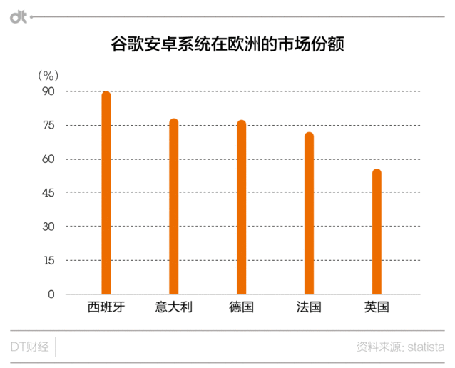 可以看出,歐盟主要針對的是谷歌預(yù)裝安卓及自己軟件的行為。歐盟以為,谷歌這樣做是在抹殺規(guī)模較小的立異型應(yīng)用制造商和服務(wù)供給商。 實在,對于預(yù)裝行為的懲罰,歐盟此前也干過。2007年了解的微軟壟斷案中,歐盟就是認定微軟濫用了其在個人電腦(PC)操縱系統(tǒng)領(lǐng)域的主導(dǎo)地位,向消費者強行推廣其媒體播放器,案件的總罰款超過20億歐元。 但此次案件與之不同的是,微軟的預(yù)裝可以直接帶來銷售利潤。而安卓則是免費的。那歐盟為何還這么擔心呢?恐怕是由于谷歌安卓在歐洲的“勢力”其實太大。 根據(jù)statista的統(tǒng)計,安卓在歐洲各國的市場份額很高,在西班牙甚至達到了九成。
