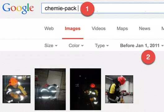 使用images.google.com,鍵入Chemie-pack (1),檢索日期設(shè)置在2011年1月(2)以前。得到的結(jié)果有數(shù)百張圖片,這些圖片是大火發(fā)生前幾天,去工廠參觀的集團(tuán)發(fā)布的。 在一些圖片中,你可以看到化學(xué)藥品和它們的名字。通過這些圖片我們可以確定大火前工廠里儲(chǔ)存的一些化學(xué)品。 在這個(gè)例子中,你通過Google搜索到的大部門圖片已經(jīng)被上傳的用戶刪除了。假如不使用Google,你將無法看到它們。 特別建議:假如想按照日期來查閱Google的索引信息, 1.使用搜索工具Search Tools->Custom Range and type 1/1/1000 2.按照日期進(jìn)行排序。