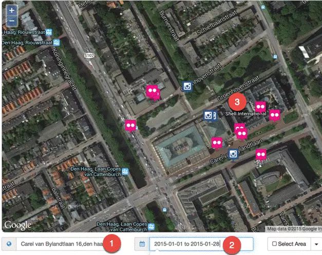 你可以在網(wǎng)站尋找信息,來分析你要研究的對象。鍵入你要檢索的樞紐詞(1),選擇時(shí)間(2),你可以看到其他人在Twitter上傳的有關(guān)圖片(3)。 假如你要搜索一個(gè)特定的時(shí)間,你還可以通過期間菜單的“Specific Range”選項(xiàng)設(shè)定你需要的時(shí)間。 7.使用Echosec 或者Geofeedia來確定人物和位置