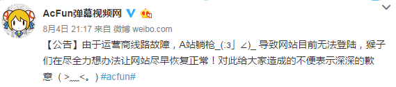 A站2016年8月2日就在官方微博上表示,因為A站服務(wù)器暫時性調(diào)整進(jìn)級,導(dǎo)致網(wǎng)站部門功能瀏覽異常,A站的技術(shù)職員在緊急修復(fù)中,給大家?guī)淼牟槐惚硎旧钌钋敢狻?/p>