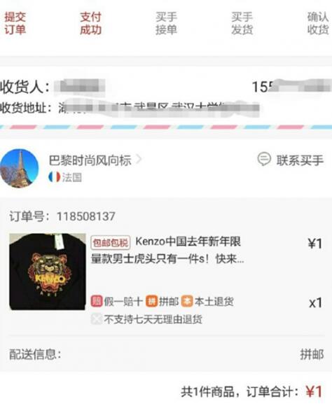 一件kenzo衛(wèi)衣讓武漢的陳同學(xué)(化名)走上了維權(quán)的道路。 11月25日,陳同學(xué)在洋碼頭“巴黎時尚風(fēng)向標(biāo)”以1元的價格搶得一件原價1599元kenzo虎頭衛(wèi)衣。誰知付款成功后,賣家卻并不愿意發(fā)貨。 為了維護(hù)自己的權(quán)益,陳同學(xué)與洋碼頭、巴黎時尚風(fēng)向標(biāo)展開一場有關(guān)消費者權(quán)益保護(hù)的斗爭。 ![]()