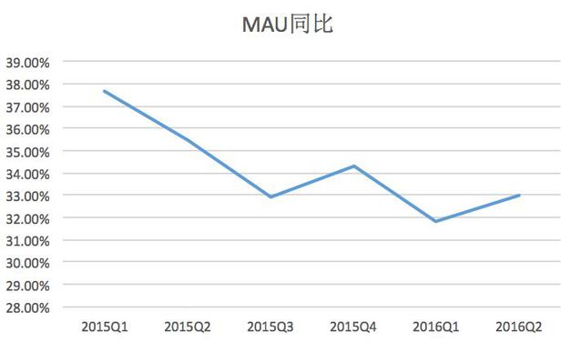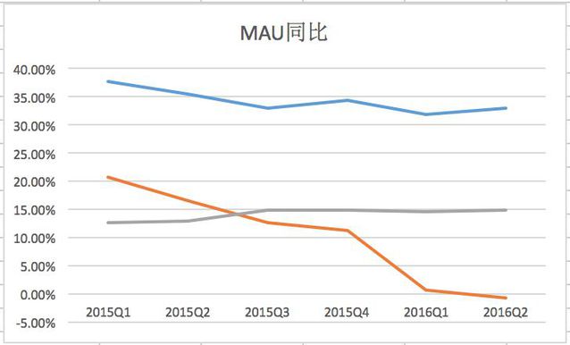主要體現(xiàn)在銷(xiāo)售、治理及行政用度這一項(xiàng)中。Twitter這一塊開(kāi)支連續(xù)兩年都占據(jù)了營(yíng)收的一半,而微博則較為克制。 這可能是影響利潤(rùn)的因素之一。說(shuō)白了,Twitter的職員開(kāi)支占比比較大。 但這好像很難去解釋為什么Twitter的活躍用戶量一直得不到快速的增長(zhǎng)。 把Facebook的MAU季同比增長(zhǎng)數(shù)據(jù)加入后,可以得到如下這張圖: