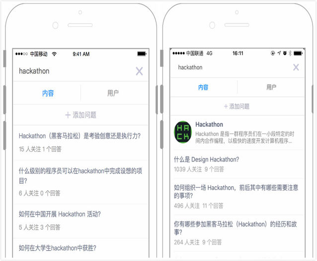 算法也做了優(yōu)化,好比搜索 hackathon,以前匹配問答中含 hackathon 這個(gè)樞紐詞的題目,這些題目質(zhì)量并不好,現(xiàn)在不僅給出高質(zhì)量的相關(guān)題目,還顯示話題。