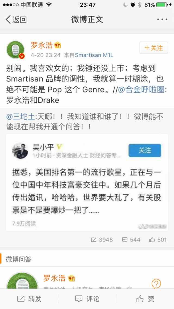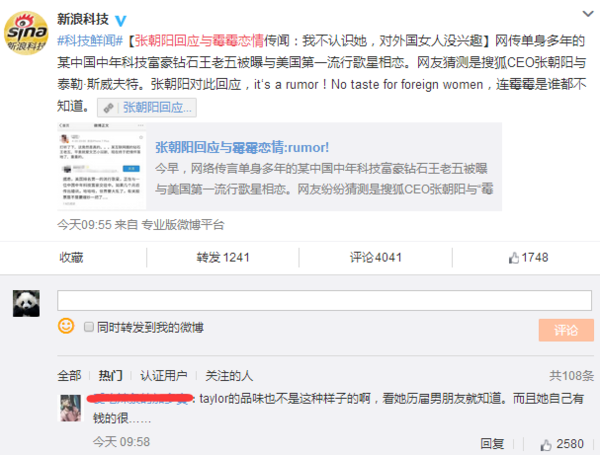 今日,張朝陽(yáng)突然登上了新浪微博熱搜,是不是決定滿臉問(wèn)候,搜狐老邁在新浪微博火了?這兩貨不是競(jìng)爭(zhēng)對(duì)手嗎?近日,網(wǎng)上瘋傳某我國(guó)中年科技富豪與美國(guó)第一流行歌星相戀,網(wǎng)友紛紛猜想這是暗指搜狐CEO張朝陽(yáng)與美國(guó)歌星是霉霉。但遭遇張朝陽(yáng)強(qiáng)勢(shì)否定,稱“我不認(rèn)識(shí)她,對(duì)外國(guó)女性沒(méi)興趣”。 這下網(wǎng)友評(píng)論的更熱鬧了,有霉霉粉絲出來(lái)辯駁稱taylor的品嘗不止如此,看她歷屆男朋友就知道,并且她自個(gè)有錢的很,言下之意即是霉霉還看不中張朝陽(yáng)呢。 一起有人為霉霉抱屈,稱張朝陽(yáng)急著跳出來(lái)回答給自個(gè)加戲,正本張朝陽(yáng)不出來(lái)回答,沒(méi)人專注這個(gè)事,也上不了熱搜,他出來(lái)加個(gè)戲,鍋還要女方背。 相較于粉絲的嘴炮,筆者更關(guān)心的是這場(chǎng)緋聞的真實(shí)性,究竟是確有其事,仍是一場(chǎng)營(yíng)銷呢?如果不是空穴來(lái)風(fēng),這個(gè)中年科技富豪究竟是誰(shuí)呢? 有趣的是,在緋聞事件還沒(méi)有多少人重視的時(shí)分,錘子科技的羅永浩第一時(shí)間跳出來(lái)撇清聯(lián)系表明:“別鬧,我喜愛(ài)女的……我就算一時(shí)糊涂,也絕不可能是Pop這個(gè)Genre。”被網(wǎng)友戲稱活潑得像高仿號(hào)。 聯(lián)系我國(guó)互聯(lián)網(wǎng)、中年、對(duì)股票有影響、富豪,本身契合條件的就沒(méi)幾個(gè)。 首要必定不是雷軍,由于雷軍英語(yǔ)不行。 劉強(qiáng)東和奶茶妹妹好著呢,也不太像。 難道是常往美國(guó)跑的賈躍亭?但現(xiàn)在的樂(lè)視風(fēng)波不斷,近期和易道的“羈絆”想必夠讓賈躍亭焦頭爛額了,賈躍亭的可能性也不大。 值得注意的事,在導(dǎo)致廣泛重視之后,爆料的原博就刪掉了這條微博,難道這次爆料是坑爹的?圍觀大眾怎么看? |