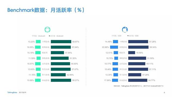 付費(fèi)率:2017年4月,移動(dòng)游戲在Android和iOS渠道的付費(fèi)率保持安穩(wěn),其間,角色扮演、動(dòng)作和戰(zhàn)略等偏重度類(lèi)型移動(dòng)游戲的付費(fèi)率環(huán)比上月略有降低; 用戶(hù)活潑度:2017年4月,Android和iOS渠道移動(dòng)游戲用戶(hù)的活潑度(Dau/Mau)全體保持安穩(wěn)運(yùn)轉(zhuǎn)態(tài)勢(shì),其間,iOS渠道角色扮演類(lèi)移動(dòng)游戲的周活潑率環(huán)比增加13.5%,月活潑率環(huán)比增加1.2%; 用戶(hù)留存率:2017年4月,移動(dòng)游戲用戶(hù)在Android和iOS渠道的用戶(hù)留存狀況有升有降;iOS渠道棋牌類(lèi)移動(dòng)游戲的一日玩家份額比較上月增加2.2%,而其次日留存率比較上月降低6.7%,7日留存率則比較上月降低11.4%; 運(yùn)用時(shí)長(zhǎng)&次數(shù):2017年4月,移動(dòng)游戲用戶(hù)的日均游戲次數(shù)在Android和iOS渠道整體有所增加,其間,休閑、卡牌類(lèi)移動(dòng)游戲的日均游戲次數(shù)的增幅相對(duì)較高;移動(dòng)游戲用戶(hù)的均勻運(yùn)用時(shí)長(zhǎng)在Android渠道保持安穩(wěn),而在iOS渠道略有降低。 |