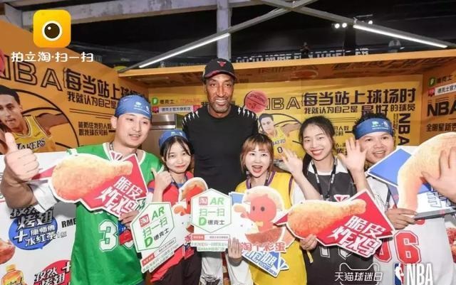 在本年NBA Hoop Party直播現(xiàn)場,NBA巨星皮蓬出現(xiàn)在現(xiàn)場,與他一同合影的工作人員手舉德克士的牌子,提示現(xiàn)場球迷運(yùn)用淘寶APP掃一掃德克士LOGO,