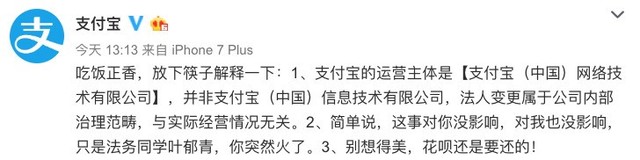 今日支付寶對外宣告,法人將從馬云變?yōu)槿~郁青。一時間引起很多網(wǎng)友的強(qiáng)烈反響,當(dāng)中最大的聲音便是:“花唄不必還了?”