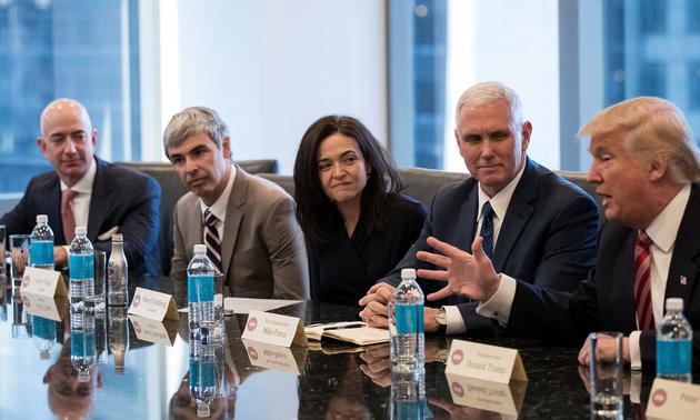 2016年12月,特朗普當(dāng)選美國總統(tǒng)后曾召集硅谷著名企業(yè)家商議,圖中左起分別為亞馬遜CEO杰夫-貝索斯、谷歌母公司Alphabet CEO拉里-佩奇