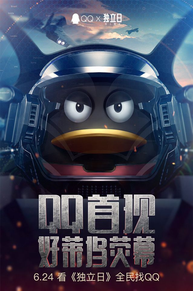 6月24日,時隔20年重啟的好萊塢科幻災(zāi)害巨片《獨立日·卷土重來》登陸中國大陸院線。影片男女主角進行地月通話,結(jié)束時電腦屏幕顯示QQ企鵝