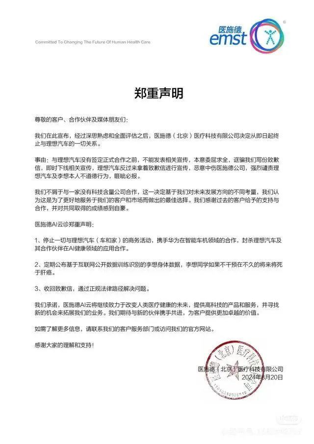8 月 19 日,一份醫(yī)施德發(fā)布的與理想汽車相關(guān)的聲明在社交平臺(tái)流傳。聲明稱,醫(yī)施德將從即日起終止與理想汽車的一切關(guān)系。 聲明指出,