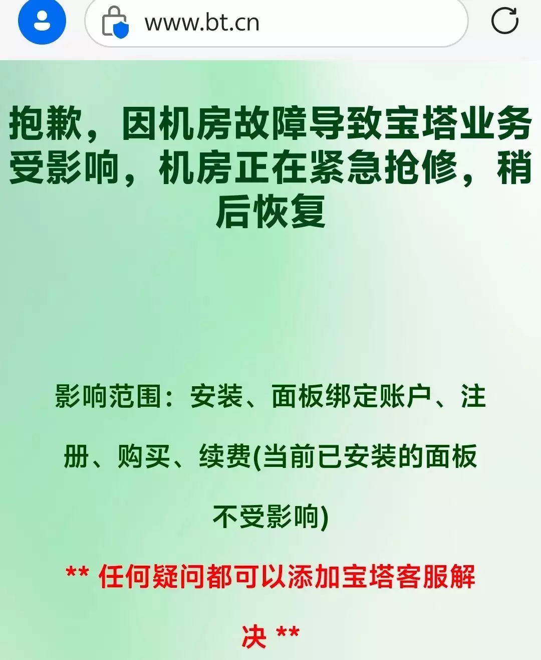 8 月 9 日消息,Linux / Windows 服務(wù)器運(yùn)維管理面板軟件 —— 寶塔面板官網(wǎng)今日發(fā)布通知: 因機(jī)房故障導(dǎo)致寶塔業(yè)務(wù)受影響,