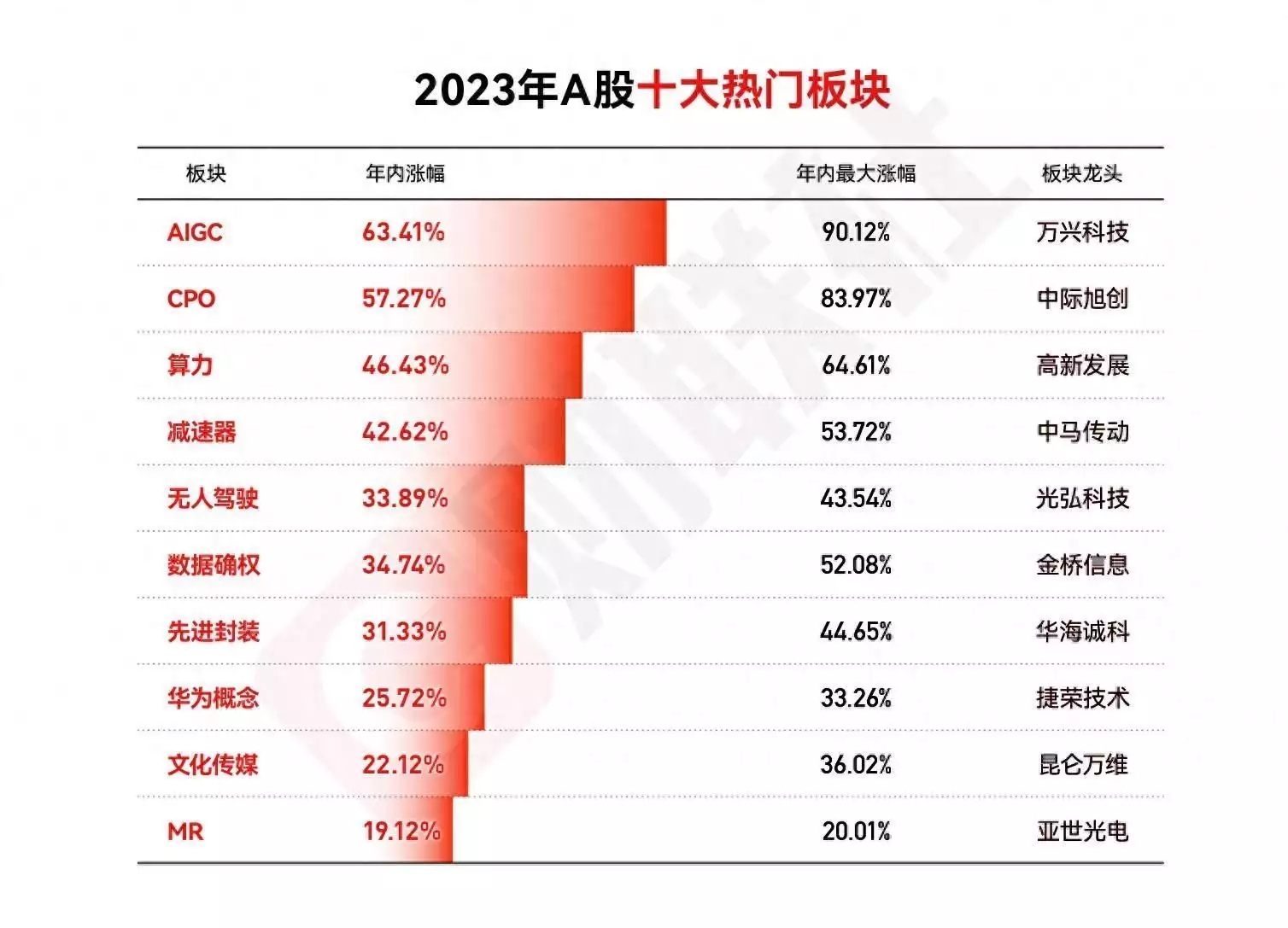 2023年是A股的題材大年,AI浪潮貫穿始終,無(wú)論是硬件端的CPO、算力,還是應(yīng)用端的AIGC都在不斷地推高市場(chǎng)熱度。AIGC全年漲超60%奪冠,成為2023年最賺錢(qián)的風(fēng)口之一。