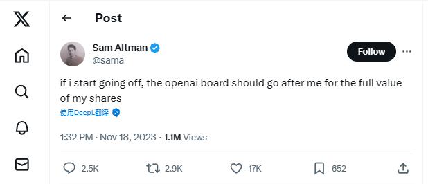 在OpenAI公司內(nèi)部,一場(chǎng)關(guān)于是否應(yīng)該“開火”的爭(zhēng)論正在上演。 當(dāng)?shù)貢r(shí)間2月15日,阿爾特曼在推特上回應(yīng)了OpenAI聯(lián)合創(chuàng)始人兼CEO山姆·阿爾特曼(Sam Altman)周三的一條推文。