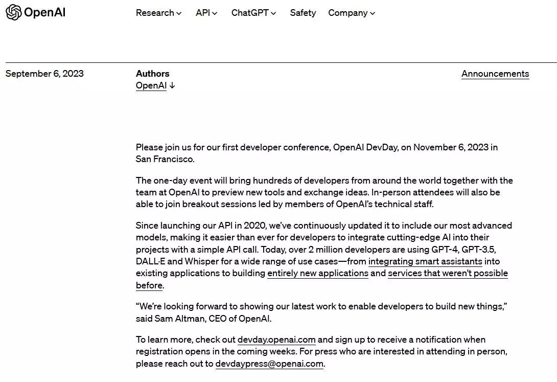 9月7日電 當(dāng)?shù)貢r(shí)間6日,美國(guó)人工智能公司OpenAI在官網(wǎng)發(fā)布公告稱,將于11月6日在舊金山舉辦公司的首屆開發(fā)者大會(huì)。 公告介紹,