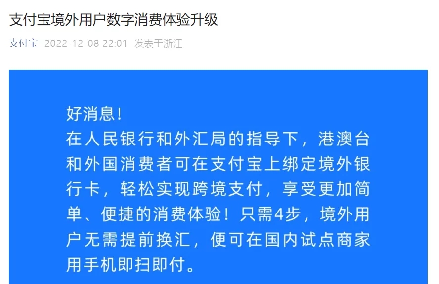 12 月 8 日消息,支付寶今天宣布,在人民銀行和外匯局的指導(dǎo)下,港澳臺和外國消費(fèi)者可在支付寶上綁定境外銀行卡,輕松完成跨境付出。