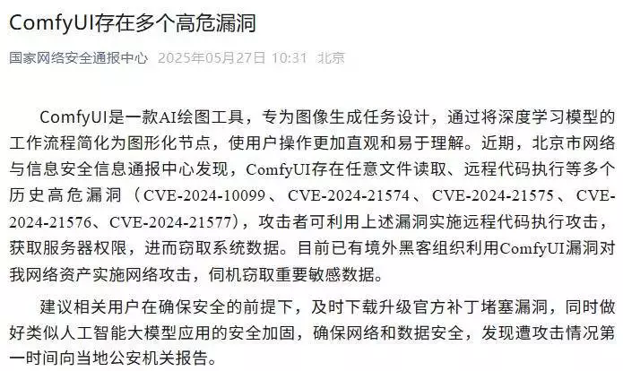 5 月 27 日消息,國家網(wǎng)絡安全通報中心今日發(fā)文,稱 AI 繪圖工具 ComfyUI 存在多個高危漏洞。體現(xiàn)了國家對網(wǎng)絡安全風險的高度重視。ComfyUI作為一款基于節(jié)點式工作流的開源Stable Diffusion工具,