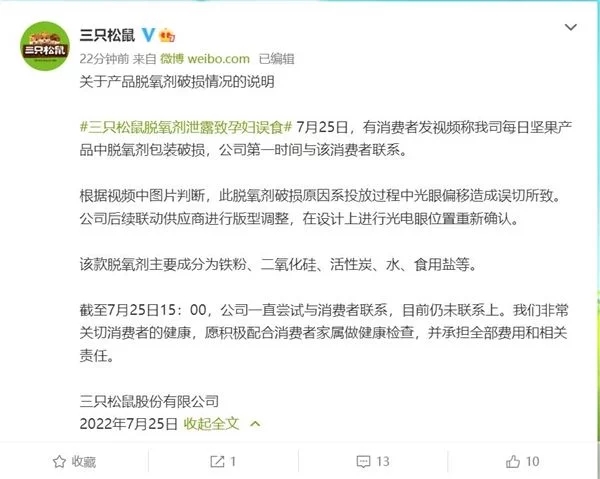 7月25日消息,一位顧客發(fā)視頻稱懷孕的老婆吃了半包三只松鼠堅果后,發(fā)現(xiàn)食品袋中的脫氧劑泄露。對此,三只松鼠稱此脫氧劑破損原因系投進過程中光眼偏移形成誤切所造成的。